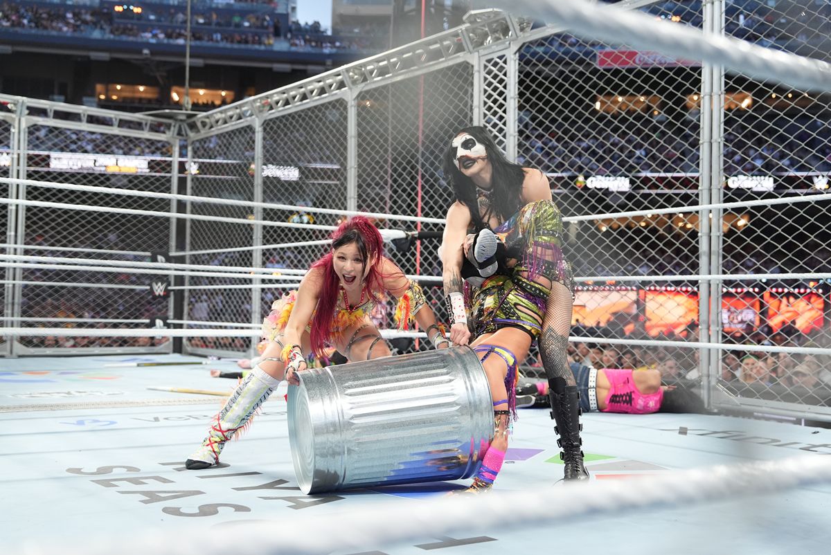 【WWE】イヨ・スカイ、4万人熱狂の“驚弾”!金網頂上から決死の“トラッシュ缶特攻ダイブ”でアスカ&カイリらを一掃