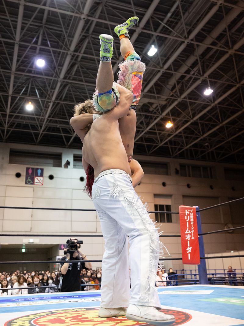 中盤にはダブルのバックドロップや、上村がドラゴンスープレックスの体勢で捕らえたところに海野がラリアットを叩き込む合体技を成功させ、流れを引き寄せた。