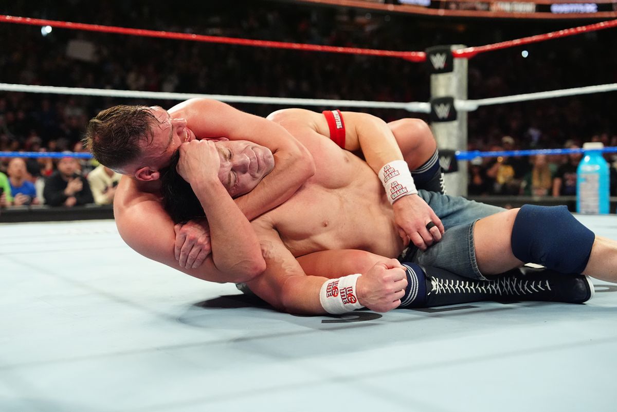 強烈な水平チョップがシナの胸板を切り裂き、強烈なジャーマンスープレックス、パワーボム、ラリアートの連打が48歳の肉体を容赦なく打ちのめす。
