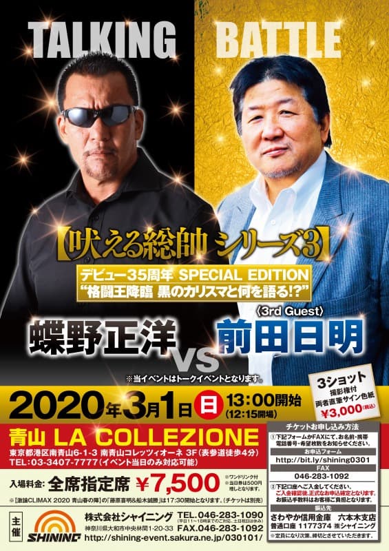 3月1日(日)東京・青山 LA COLLEZIONEにて注目のイベント、吠える総帥 シリーズ3『蝶野正洋vs前田日明』、激論CLIMAX 2020青山春の陣『藤原喜明vs船木誠勝』が開催される。