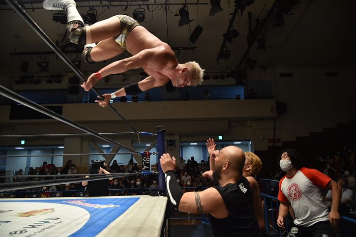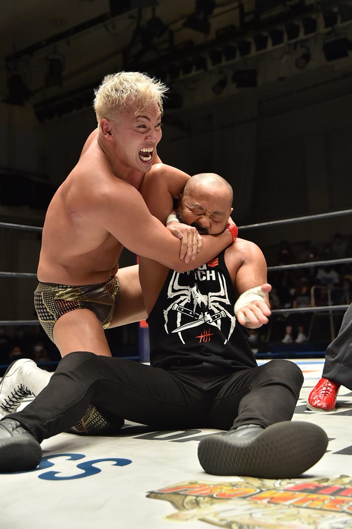 終盤にも3人がかりのスーパーパワーボムを被弾、気力を振り絞って裕二郎と邪道をトペ・コンヒーロで排除し、最後は外道に変形コブラクラッチで勝利した。