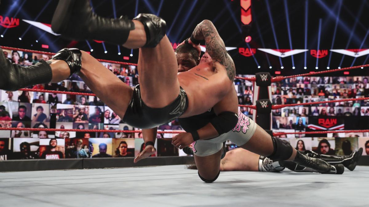 さらに終盤ではロリンズのカーブ・ストンプをかわしたリーがロリンズに必殺のスピリットボムを叩き込んだが、その隙をついたオートンがRKOをリーに炸裂させると倒れていたロリンズからピンフォールを奪取。