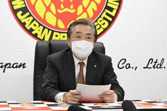 「ご視聴の皆様、こんにちは。本日はオンラインでの会見となりますが、ご視聴いただき、ありがとうございます。早速ですが、私より発表させていただきます。まず、二冠王者の飯伏幸太選手よりかねてより要望がございました二冠統一に関してですが、昨日の結果も踏まえ、当社で協議した結果、現王者の意向も尊重し、IWGPヘビー級王座とIWGPインターコンチネンタル王座を統一し、両王座の歴史を継承したIWGP世界ヘビー級王座を新たに制定することになりました。また、ベルトも新調いたします。これにより、初代王者は飯伏幸太選手に認定し、初防衛戦は4月4日両国国技館大会にて『NEW JAPAN CUP 2021』の優勝者とおこなうことといたします。」