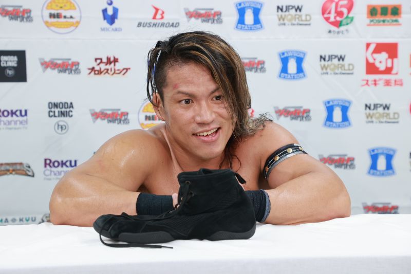 俺たちがベルトを持って、ベルトの価値が落ちたって言ってるからよぉ、なぁ、見ものじゃねぇか。フハハハ。タッグの完成度と経験値の高ーい、アイツらのチャンピオン像というのを、見てみようじゃねぇか。フハハハハ。あ、ファンタズモはちょっと、今日のダメージで来れねぇからよぉ。だが、コレ(シューズ)はこっちにあるぜ」