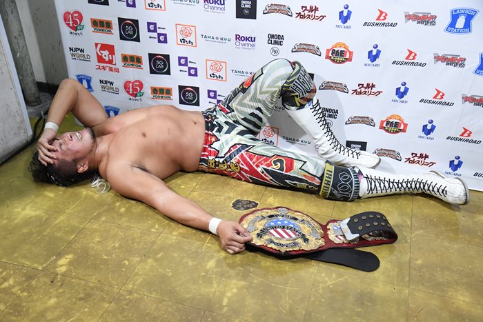 棚橋「(※ヤングライオンに肩を借りながら現れて、床に倒れ込み)いやああああ、ぐあああ、クソーッ! ああ、クソーッ! クソーッ! 負けだ。2敗はまずい。クソーッ! 逆転サヨナラ負けだ、逆転サヨナラ。ああ負けだ……。(※うつ伏せで床に置かれたUSヘビー級王座のベルトを見つめながら)USがテキサスに負けちゃダメでしょう。これは、これは責任重ぇな。これは『G1』優勝して、チェーズを指名するしかねえな」