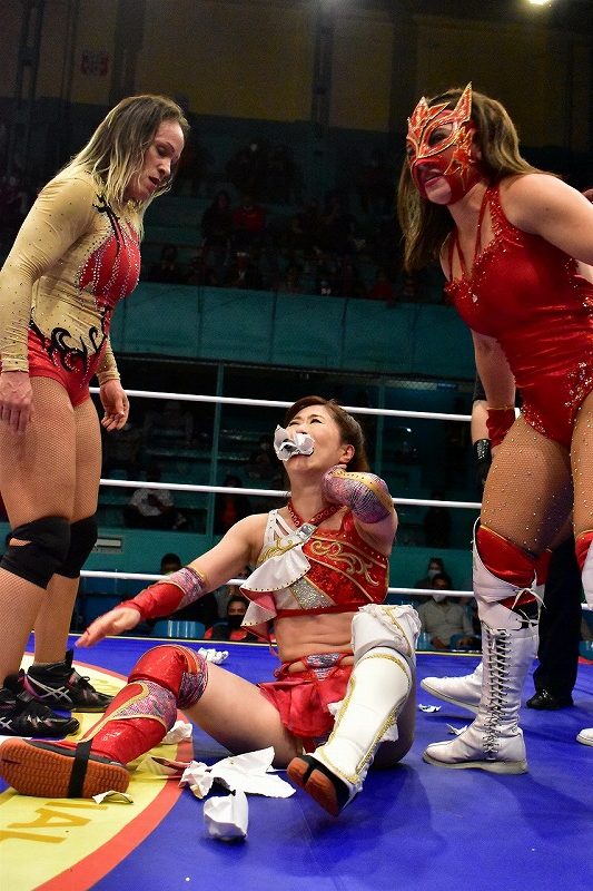 試合後、アイスリボンの応援ボードを作って応援してくれていた地元ファンのボードを取り上げたメキシコ軍は、リング上でびりびりに破く。そしてダリスがアイスリボンのロゴ部分を藤本の口に突っ込むという屈辱的なエンディングが待っていた。