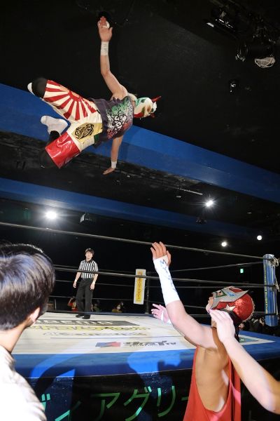 ジャックがトップロープを利したプランチャ、ステージから飛び込んでコルバタを決めれば、ユーセーはトペを決めるなど、ルチャリブレをベースとした2人は、それぞれ持ち味を発揮。