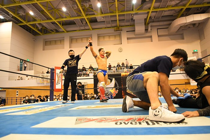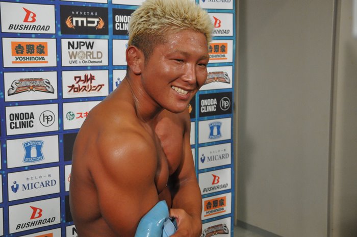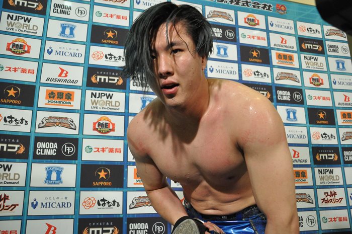 オイ、川人、リベンジ・コンプリートだよ、とりあえず。去年の借りは返したぞ。まだこの先、借りを返さなきゃいけないヤツはたくさんいるんだよ。それにしても開幕3連敗だってな。IWGPジュニアタッグチャンピオンベルトが泣いてるんじゃないか?まあでも今、この公式戦で目を向けてるのはIWGPジュニアシングルのベルトだ。とりあえずはまだ大人しくしておくよ。