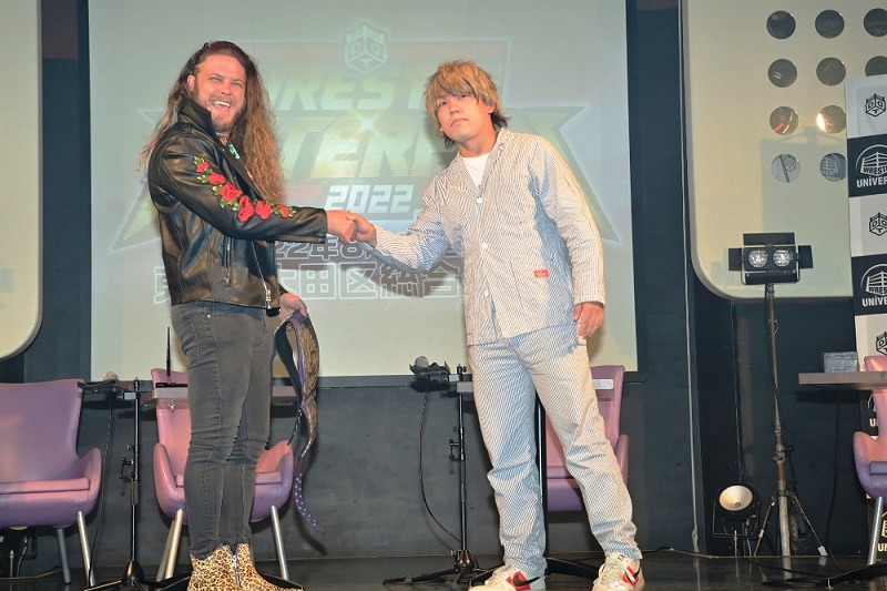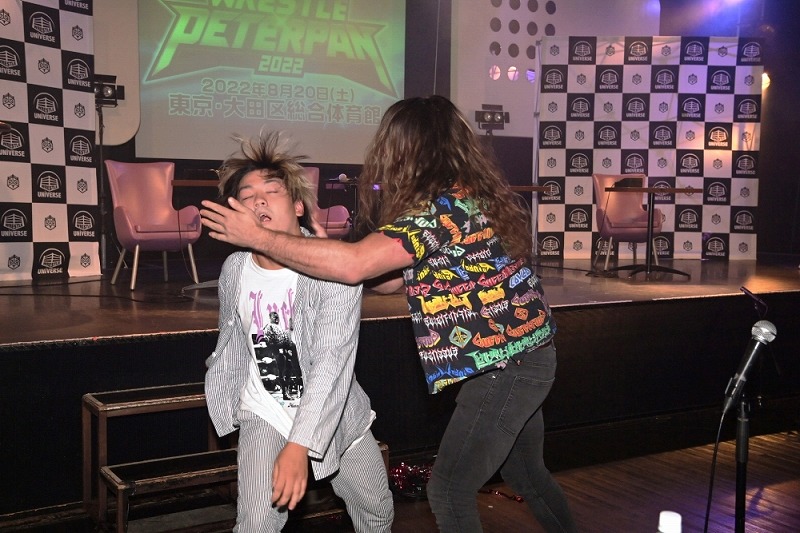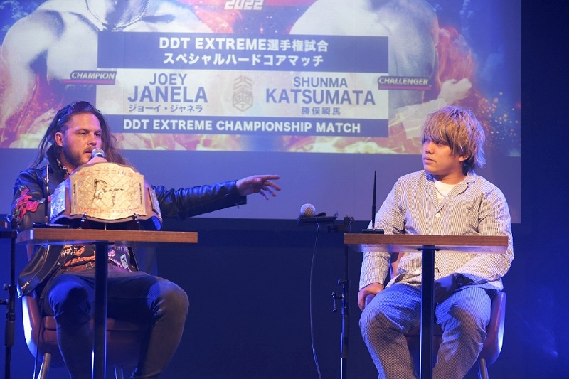 DDTプロレスが8月16日、東京・渋谷区のライブハウスduo MUSIC EXCHANGEで、真夏のビッグマッチ「WRESTLE PETER PAN 2022」(同20日、東京・大田区総合体育館)に向け記者会見を開き、DDT EXTREME新王者のジョーイ・ジャネラが渋谷の路上で挑戦者の勝俣瞬馬をKOした。