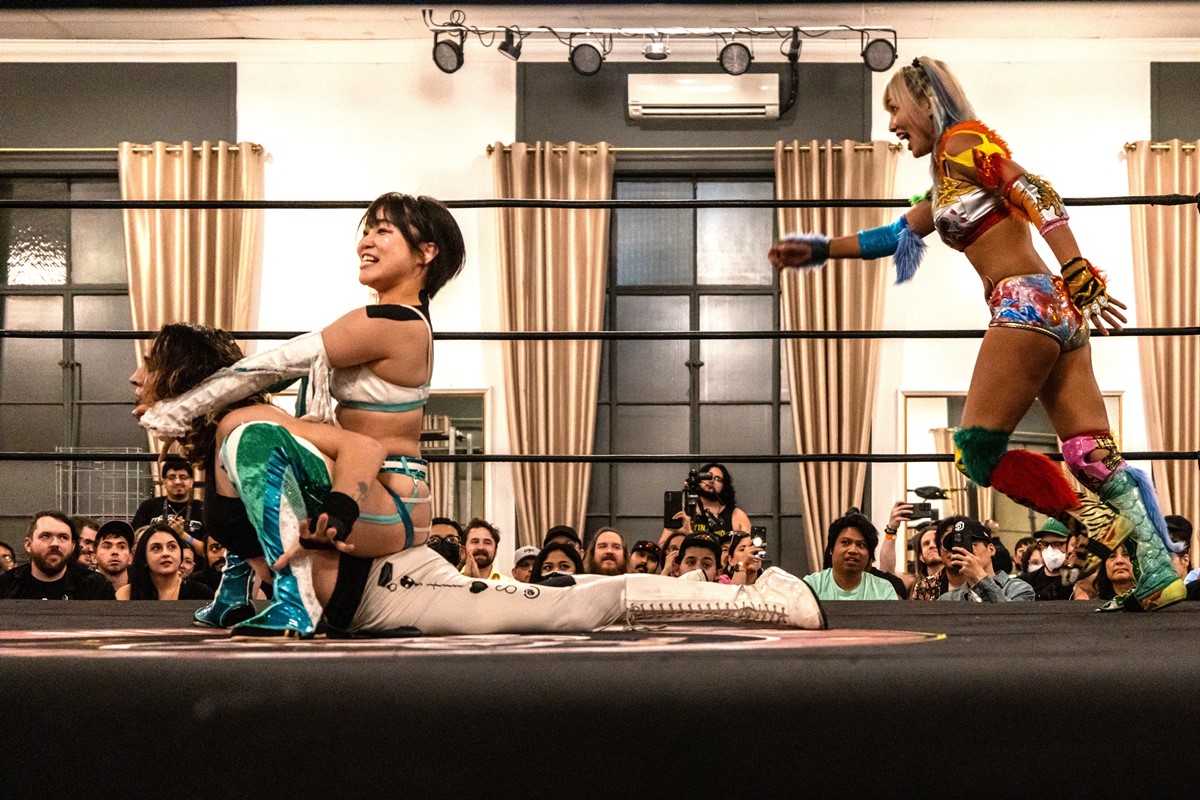 その後、世界が新型コロナウイルス禍に見舞われ、海外での活動は休止せざるを得なくなった。それでも22年10月、ようやく2度目のメキシコ遠征が実現した。こんどは前回の2会場に加えアレナ・コリセオ、プエブラを含む7大会、さらにローカルプロモーションの2大会にも参戦した。アレナ・メヒコでは「グランプリ」という女子のビッグマッチにも登場。メキシコvs多国籍軍の図式で、本間、清水、駿河メイが日本代表だ。