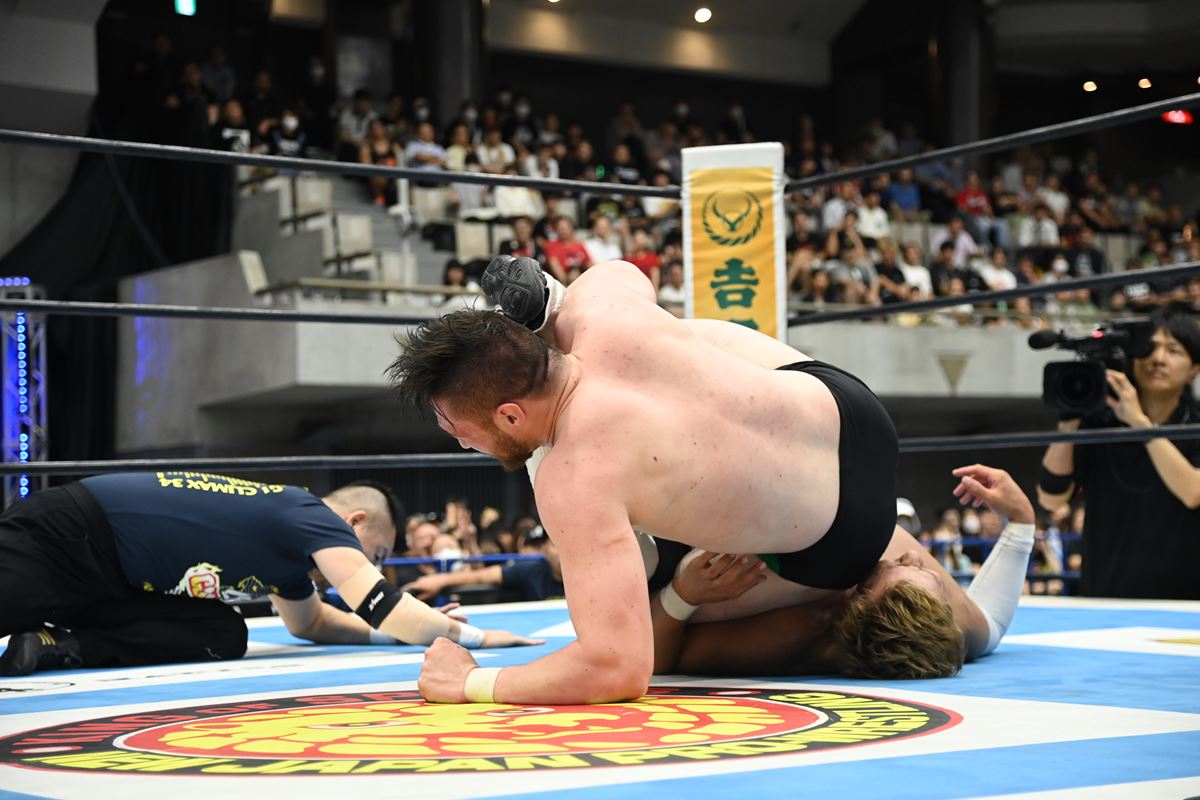 カラム「今日は座らせてくれ。ついに言える時が来たな…。俺の名前はカラム・ニューマン。俺はイギリスの一番クソな地域出身だ。それがエセックス。エセックスの中でも一番クソな場所に住んでいた。何年もの間、プロレスを辞めるべき、何者にもなれない、コンビニで働く方がマシと言われ続けてきた。今となっては、そいつら全員クソくらえだ。俺の名前はカラム・ニューマン。そして俺は『G1 CLIMAX』の最後の出場者となった。『G1』史上最年少の出場者だ。今ここで『G1』制覇を約束することはしない。でも明日イギリスに帰って、両親と飼い犬を抱きしめたら、日本に戻ってくる。『G1』制覇とは言わない。俺は、『G1』史上、最強のスターになってやる」