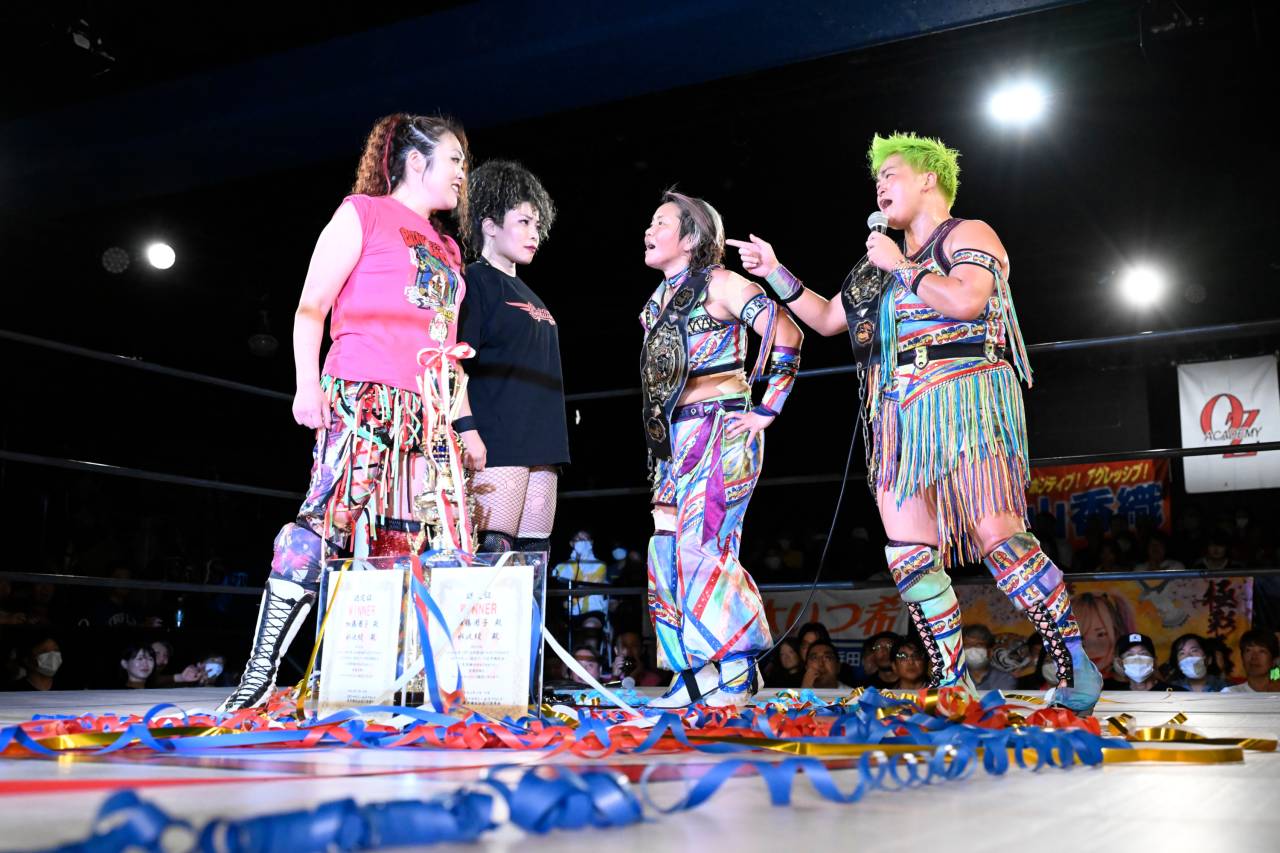 そこに、この日勝利を収めた”ゴジゾネス”松本浩代&ZONESが挑戦表明。H2Dがこれを受諾し、8月18日後楽園ホール大会でタイトル戦が決定。