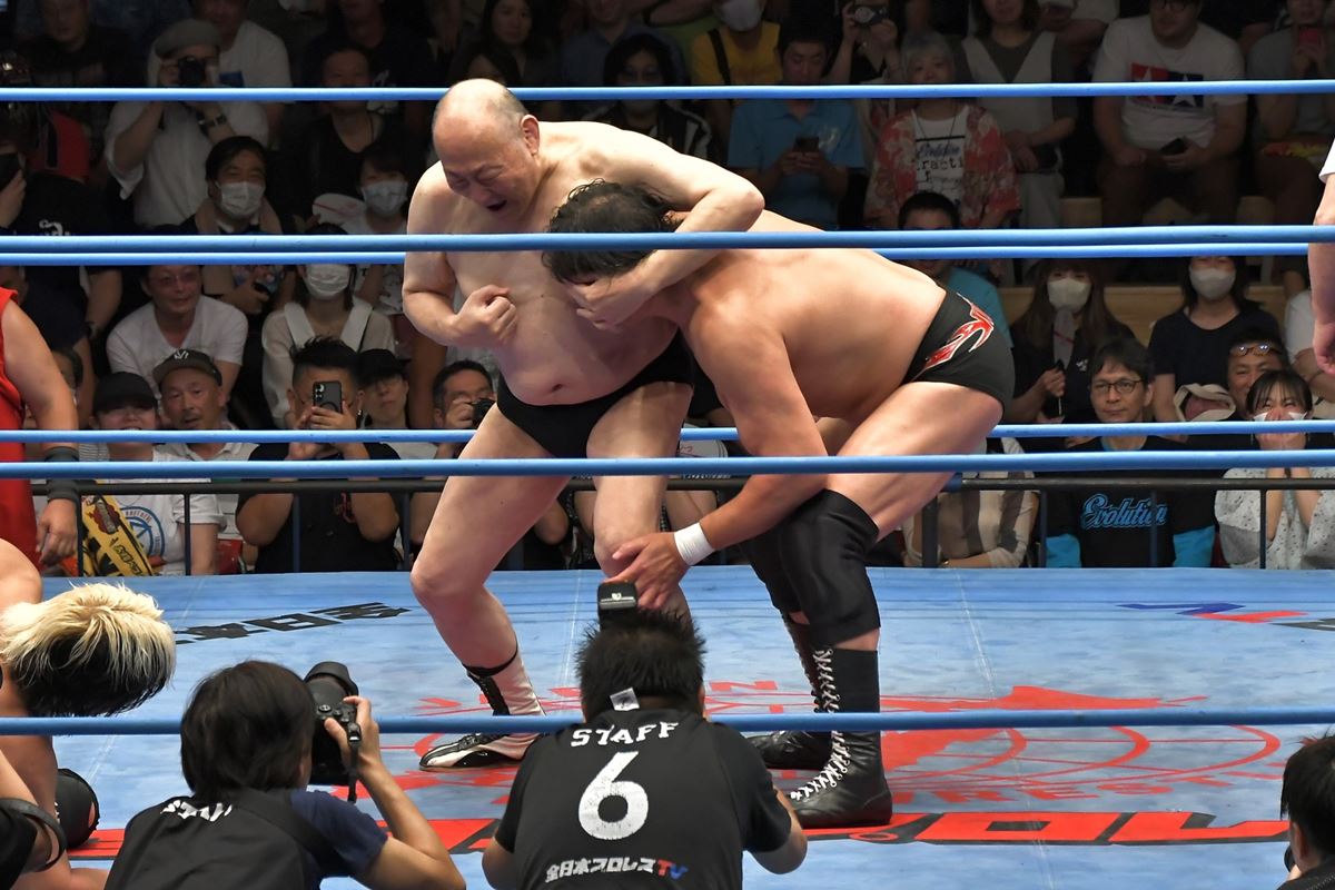 同じく王道の生き字引・渕正信が斉藤ジュン、レイを率いたトリオと諏訪魔、田村男児、大森隆男組の6人タッグマッチを、いつも通りの軽快な動きと硬軟織り交ぜた絶妙なサジ加減のレフェリングで裁いた。加えてこの日はメインイベントの三冠戦(安齊勇馬VS本田竜輝)も担当するなど、まだまだ現役バリバリぶりを披露した。