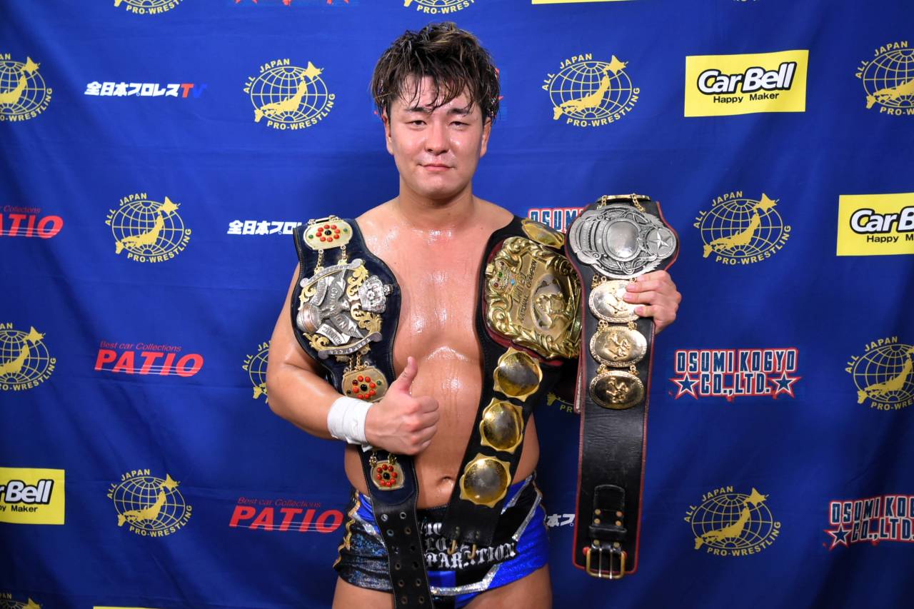 「人生で初めてだ。こんな三冠のベルトを持つなんて。青柳優馬が入団した時にはもうすでにこのベルトはなかったから。ヤバいね。嬉しすぎるよ」#ajpw #ajpw52 pic.twitter.com/L4sURv1Xgq