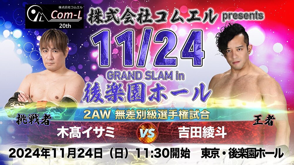千葉密着・発信型プロレス団体2AW無差別級王者・吉田綾斗が、11月24日に後楽園ホールで開催される「GRAND SLAM」にて、挑戦者・木髙イサミを相手に防衛戦に挑む。デビュー9周年を迎えた吉田は、記者会見でプロレスリングBASARAを率いるイサミを「何か腹立つ」と評しつつ、タイトル防衛への自信を示した。
