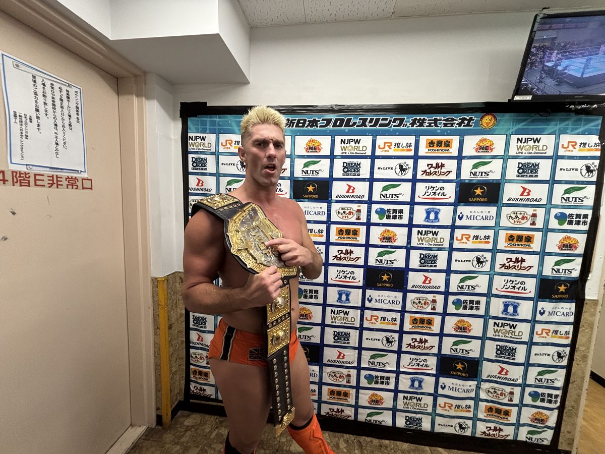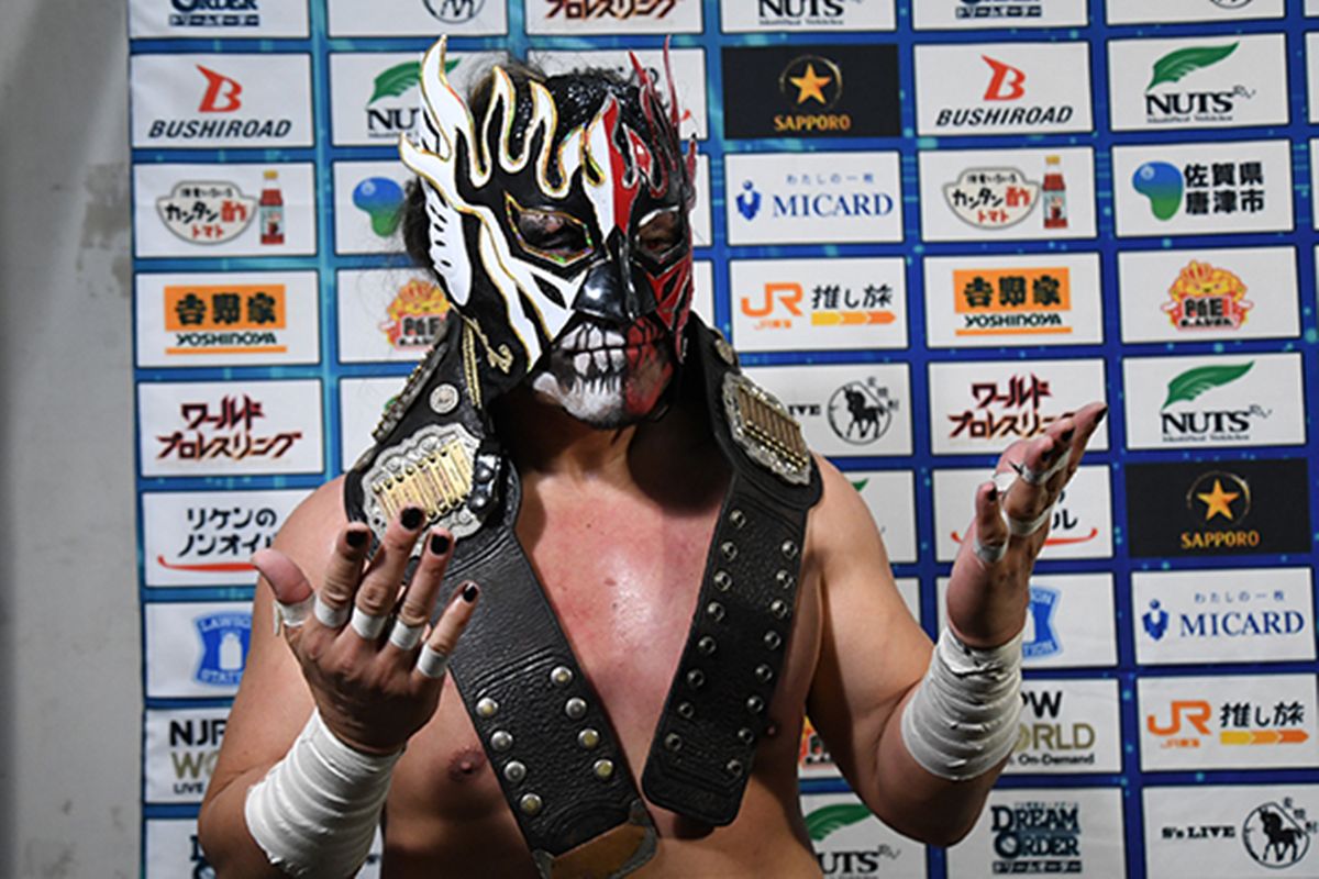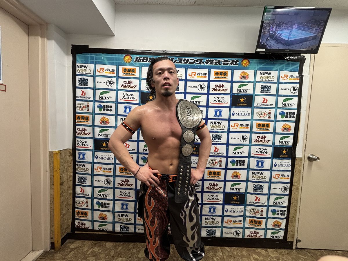 デスペラード「(※IWGPジュニアのベルトを首の後ろに巻いて)8回って……8回って、長い……ね。俺もだいぶ時間かかった方だけど、かかって溜まった分、当たるとデカいんじゃないすかね。まあ、『今までのことは気にしてない』って言ってもらったから、後藤さんとはちゃんと、いいチームにな……太鼓は叩かん」