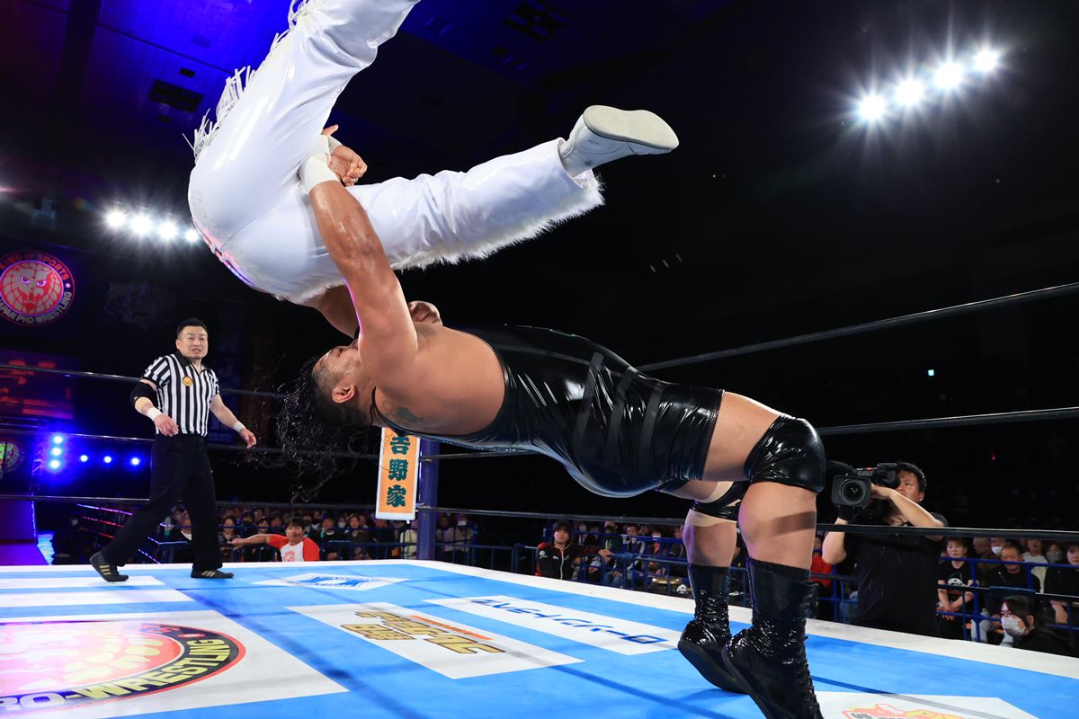 序盤からコブのフィジカルの強さが光る展開が続く。海野が持ち上げようとしたブレーンバスターも、コブが逆に持ち上げて豪快に叩きつける。