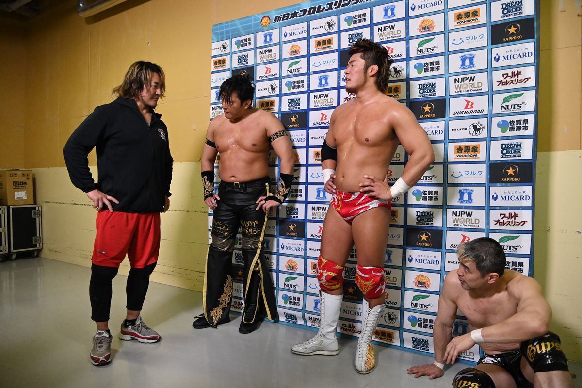 そこへ現れたのが、新日本プロレス社長の棚橋弘至であった。タイチ、上村、TAKAの前に立ち、「タイチ、上村、TAKAさん……単刀直入に、手を組もう」と要請。さらに「DOUKIも含めた4人……本隊に入って。Just 4 Guysの魂は、持ってたらいいから。それよりも、BULLET CLUBの反則、介入で、離れていくファンを失う方が、新日本にとっては問題だから。1回、みんなで考えといて」と説得を試みた。