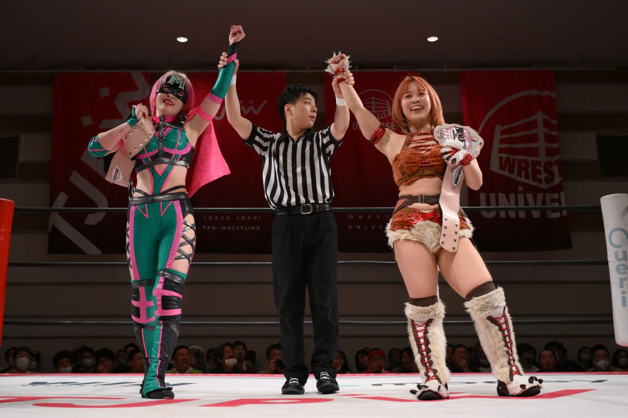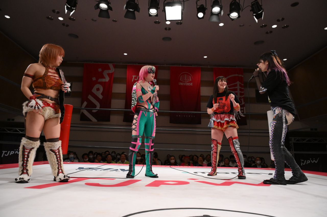 東京女子プロレスは22日、神奈川・横浜ラジアントホールにて『TJPW SPRING TOUR 2025 IN YOKOHAMA』を開催。上福ゆき&上原わかなが新プリンセスタッグ王者組の中島翔子&ハイパーミサヲの”享楽共鳴”に挑戦表明をした。