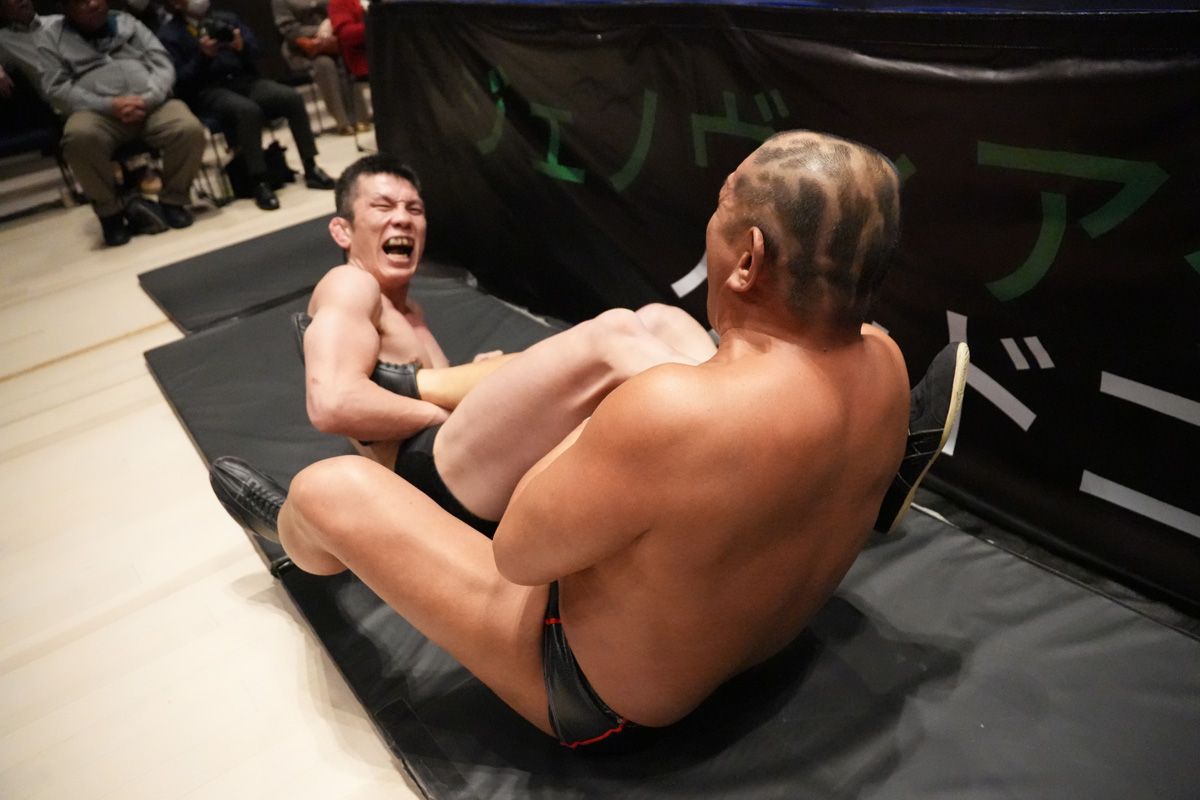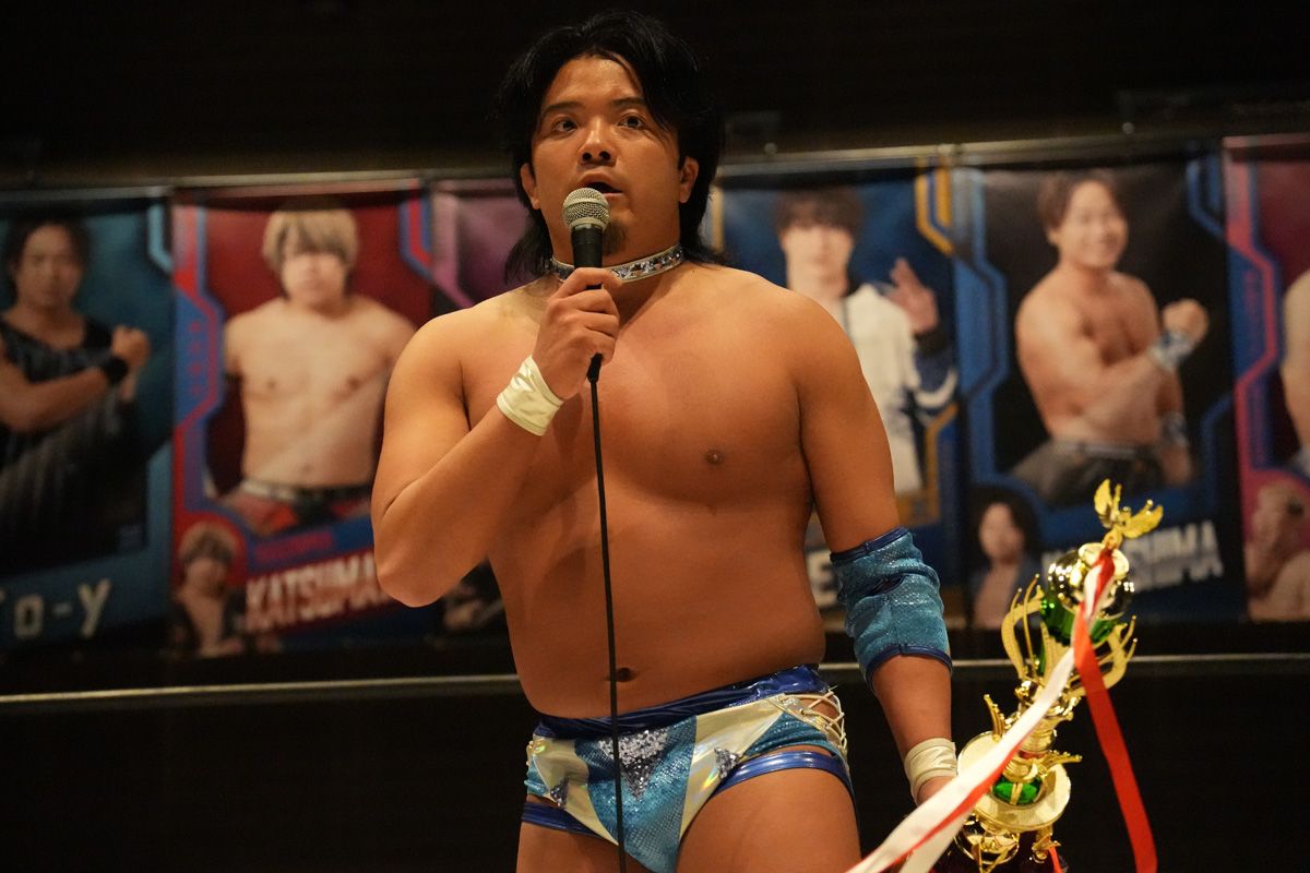 青木と鈴木は禁断の対決となり、鈴木が青木を挑発していくと、中村が割って入ろうとする。鈴木と彰人にも捕まってしまった中村だったが、執ようなフルネルソン狙いから、変形十字架固めで丸め込んで、大先輩の彰人から殊勲の星。試合後のバックステージでは、両者ともに王座戴冠を誓い合っていた。