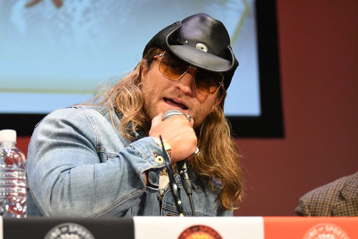 新日本プロレスは4月3日、東京・飛行船シアターで『餓狼伝説 City of the Wolves presents Road to SAKURA GENESIS 2025~Jr.GENESIS~』の公開調印式を開催。翌4日後楽園ホール大会で行われるIWGPジュニアヘビー級選手権試合ハードコアマッチに向け、王者エル・デスペラードと挑戦者クラーク・コナーズが登壇し、決意を語った。