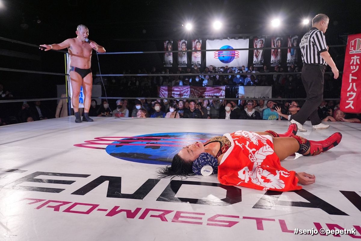 4・29東京・後楽園ホールでの引退を控えるセンダイガールズ(仙女)の里村明衣子が、4月3日の東京・新宿FACE大会で鈴木みのるとシングルマッチをおこなった。「女子プロレス界の横綱」と言われる里村が、「プロレス王」鈴木と最初で最後の一騎打ち。試合は25分6秒、鈴木のゴッチ式パイルドライバーで里村が壮絶に散った。試合後の里村は、大の字で天井を仰ぎながら鈴木のマイクを聞いた。そこで、この闘いは鈴木からのリクエストで実現したことが明かされたのである。