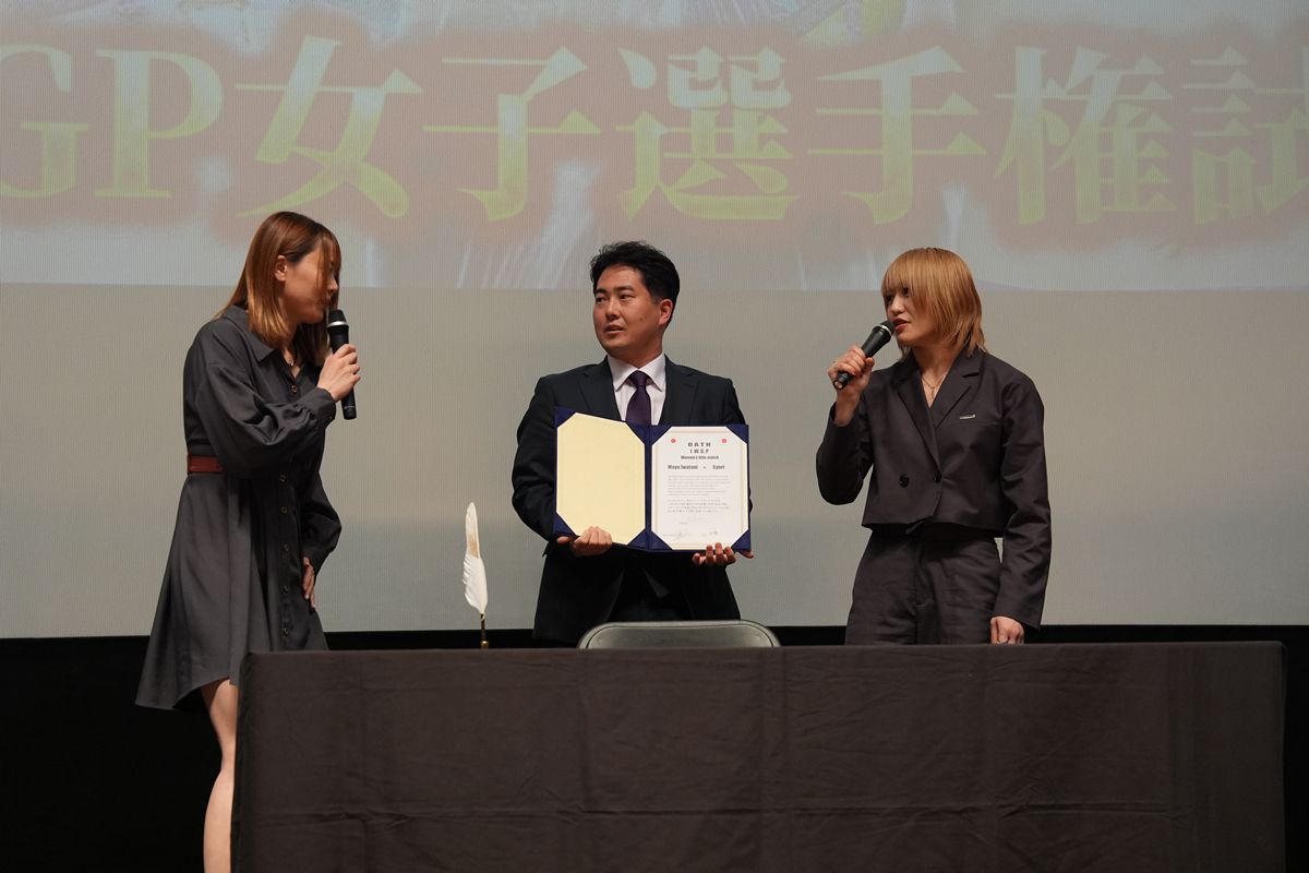 【スターダム】IWGP女子王座V10戦へ向け、岩谷麻優と朱里が調印式 “蹴りの覚悟”が揺さぶった王者の決意