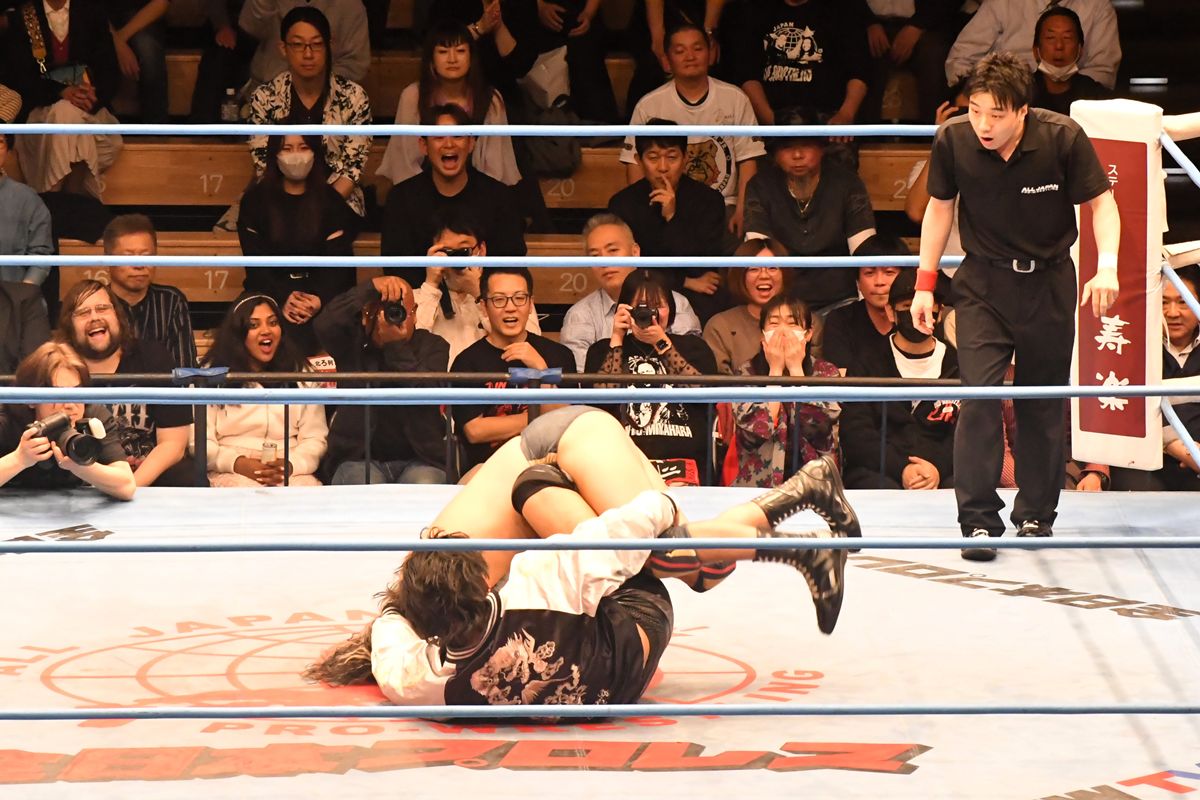 一方の安齊は、動揺せずに冷静さを保った。不意打ちに耐え、猛攻をしのぎ、鋭いジャンピング・ニーを打ち込み反撃の糸口を掴むと、最後は剣山でナルシストプレスを防御し、体勢を入れ替えての丸め込みで3カウントを奪取。