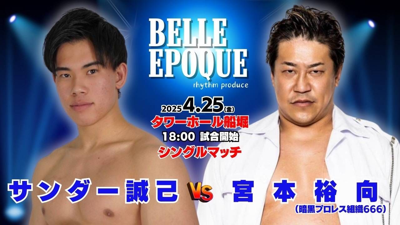 rhythm:「大会タイトルの“Belle Époque(ベルエポック)”って“美しき時代”という意味なんですけど、世代間を越えた対決がテーマで。19歳のJTO所属・サンダーにとっては、キャリアも年齢も大きく上回る宮本さんとの試合は試練だと思います。宮本さんは年間で多くの試合に出場するベテランなので、若手のサンダーとの試合を組んでみました。