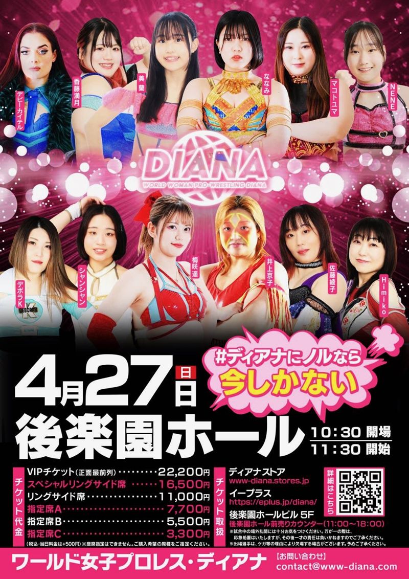 ワールド女子プロレス・ディアナは、4月27日(日)に東京・後楽園ホール大会を開催する。開場は10時30分、第0試合は11時20分から、第1試合は11時30分開始予定。