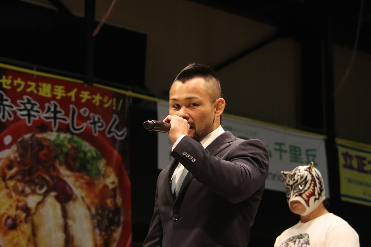 吉野レフェリーの前説タイム中に総合格闘技で活躍している手塚基伸がリングに登場。