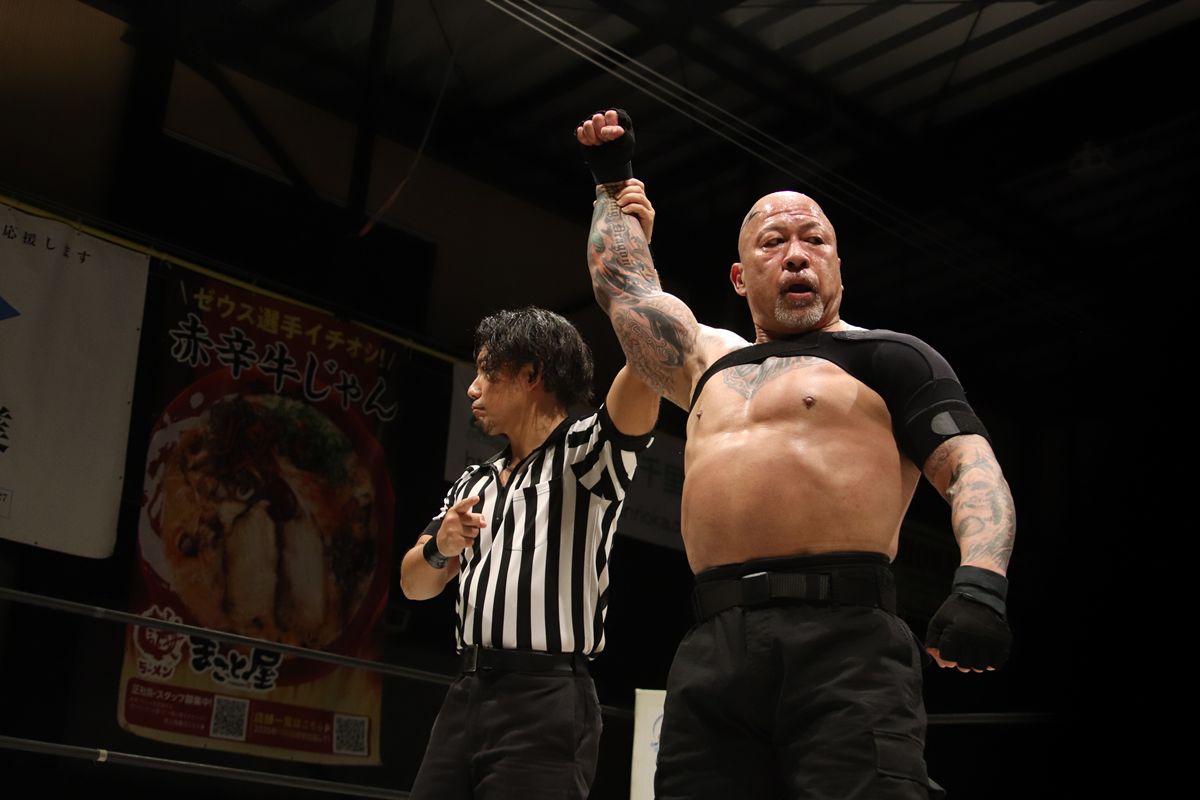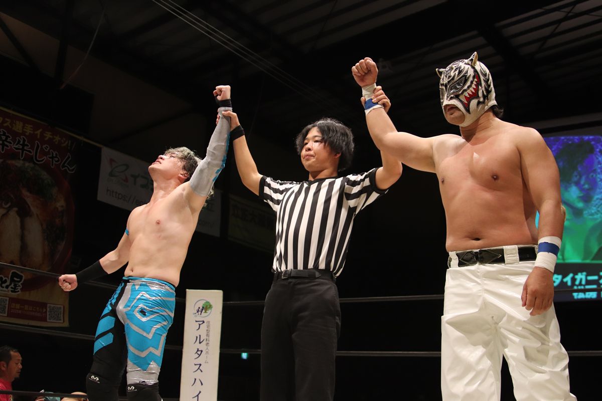 大瀬良はコーナーへの投げっぱなしブレーンバスターの荒っぽい攻撃で木下の動きを止め、急所蹴りからミスティカ式のクロスフェースロックを鮮やかに決めた。