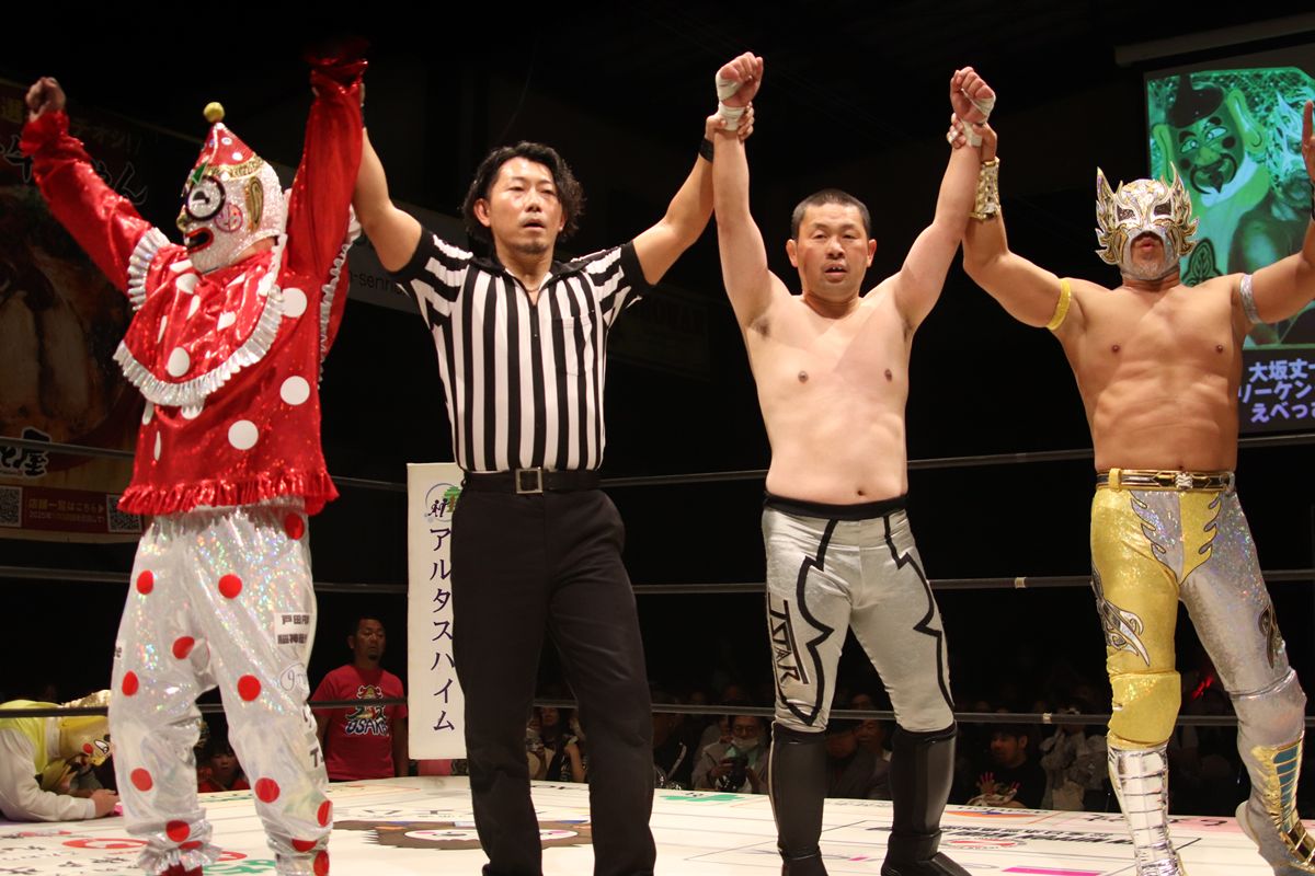 村浜武洋&ツバサ&○くいしんぼう仮面 vs 大坂丈一郎&ビリーケン・キッド&えべっさん×
