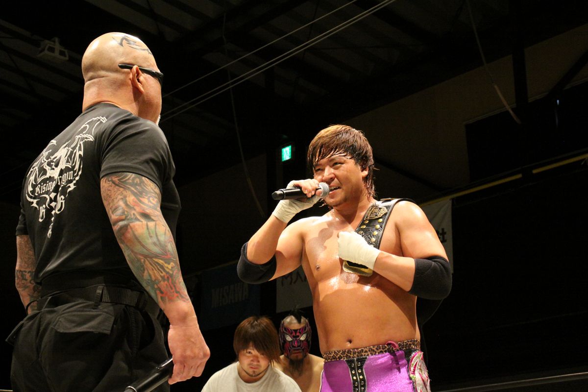 マイクを持った王者TORU「一年で3回ぐらいしか防衛戦がなかったこの王座を生き返らせたのはこの俺や次の挑戦したいやつおらんのか?」と挑発すると入場口からボディガーが登場し「最年少蒼嵐の奮闘に心を打たれた。お前とは以前の天王山で反則まみれでやられた以来シングルやってないよな。今度は57歳最年長のこの俺がお前の王座を獲りに行くからな。会社が許せば6・15森ノ宮大会で挑戦したい」と王座挑戦をアピール。王者TORUはボディガーの挑戦を受け止めつつ、「佐野と試合をするのが怖かった。間違いなく最強の挑戦者でした。佐野の時代はいつかくるだろうでもあいにく今はTORUの時代やからよ」とうそぶき、これからもTORU率いるローグネイションかた目を離すなと豪語してビッグマッチを締めた。
