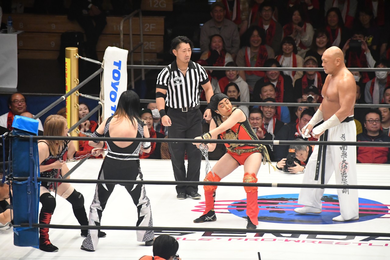 試合は尾崎が持ち込んだチェーンを3人で引っ張り合うと、しぶしぶリングインした新崎が加勢して一気に引き寄せると尾崎へ地獄突きを見舞う。そこから拝み渡りの共演で会場が沸く。