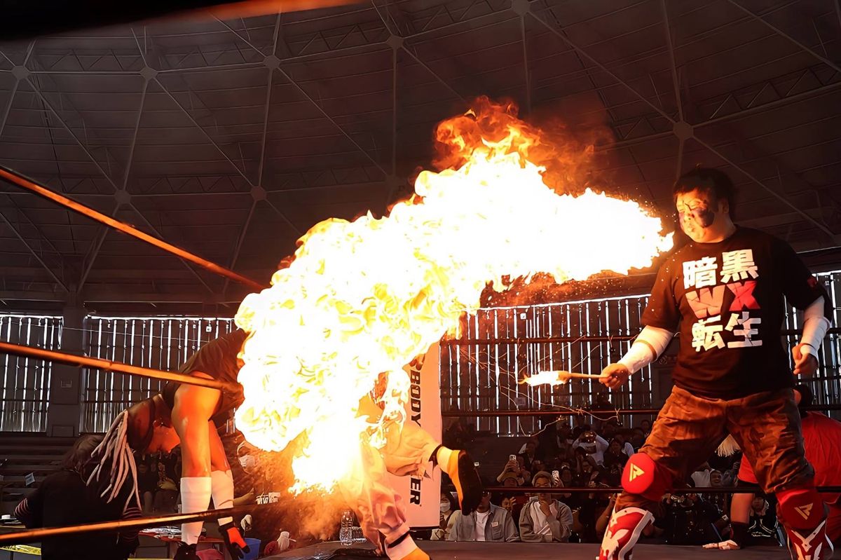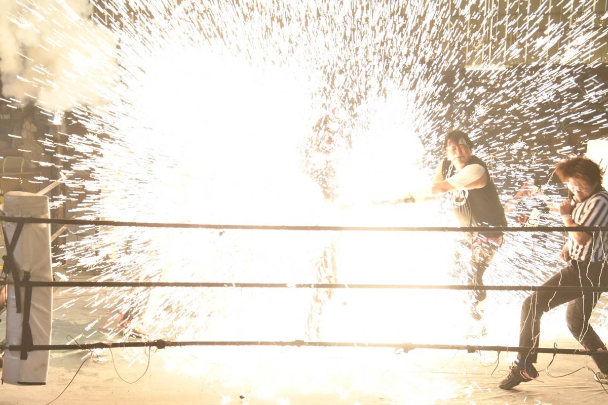 大仁田の劣勢は続き、崔が櫻井の背中へ電流爆破バット振り下ろし、続け様にポーゴが火炎攻撃を浴びせる。