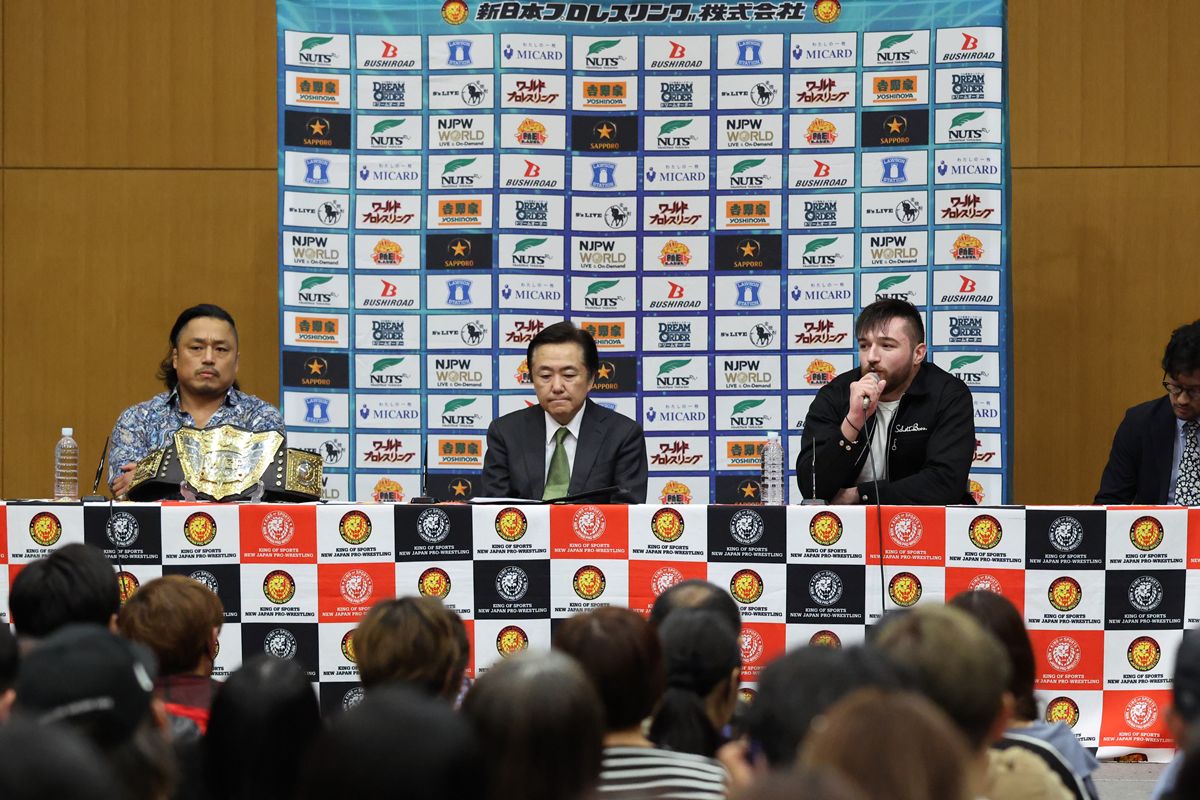 王者・後藤洋央紀と挑戦者・カラム・ニューマンが登壇し、それぞれの決意を語った。