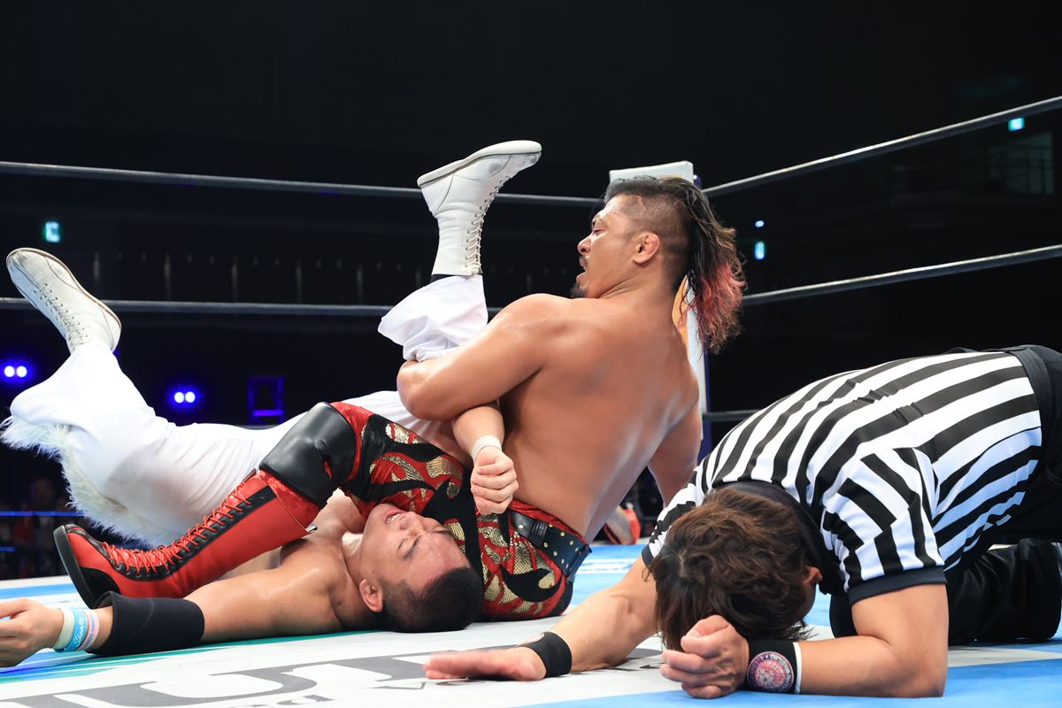終盤、海野は渾身のラリアットやパワーボムを立て続けに見舞い、試合を決めにかかった。しかし、鷹木はそれをすべてはね返す。張り手、エルボー、そして強烈なパンピングボンバー。