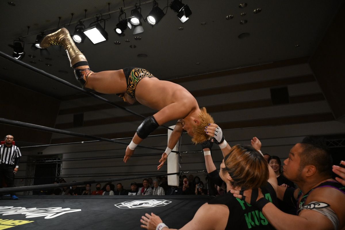 序盤、渡瀬は場外の2人めがけて、トップロープ超えのトペコン・ヒーロをぶっ放つ。入江はウラノの体の上でPSYCHOにパイルドライバーをさく裂させるなどパワフル殺法全開。