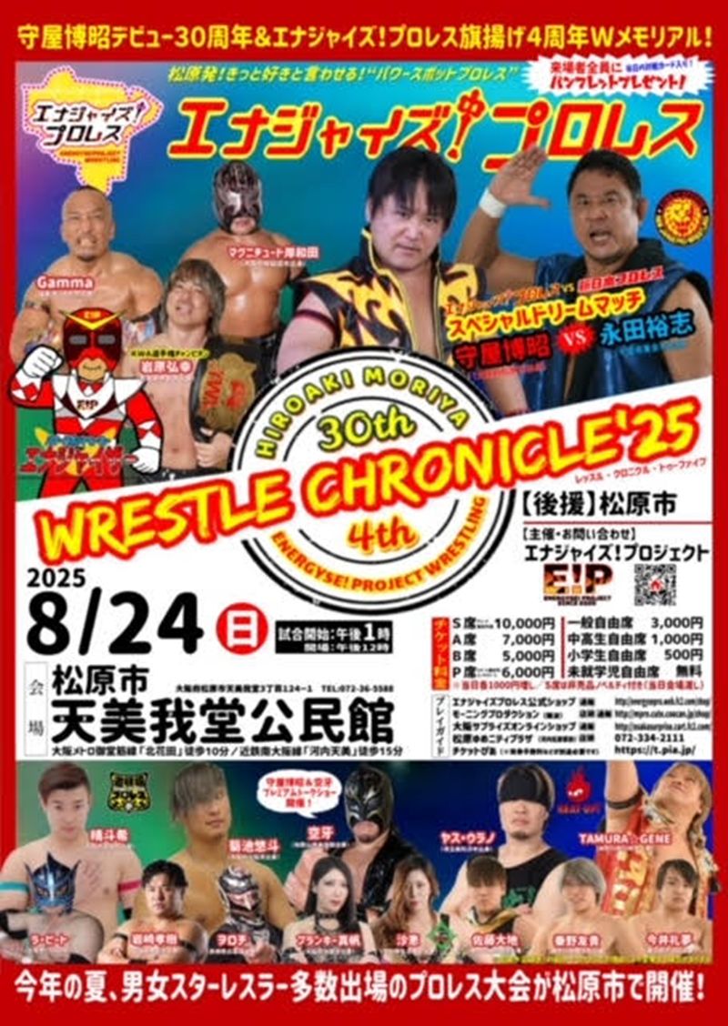 エナジャイズ!プロレスは、8月24日(日)に大阪・天美我堂公民館で開催する大会『WRESTLE CHRONICLE’25 ~守屋博昭デビュー30周年&エナジャイズ!プロレス旗揚げ4周年Wメモリアル~』の第1弾決定カードおよび出場予定選手を発表した。