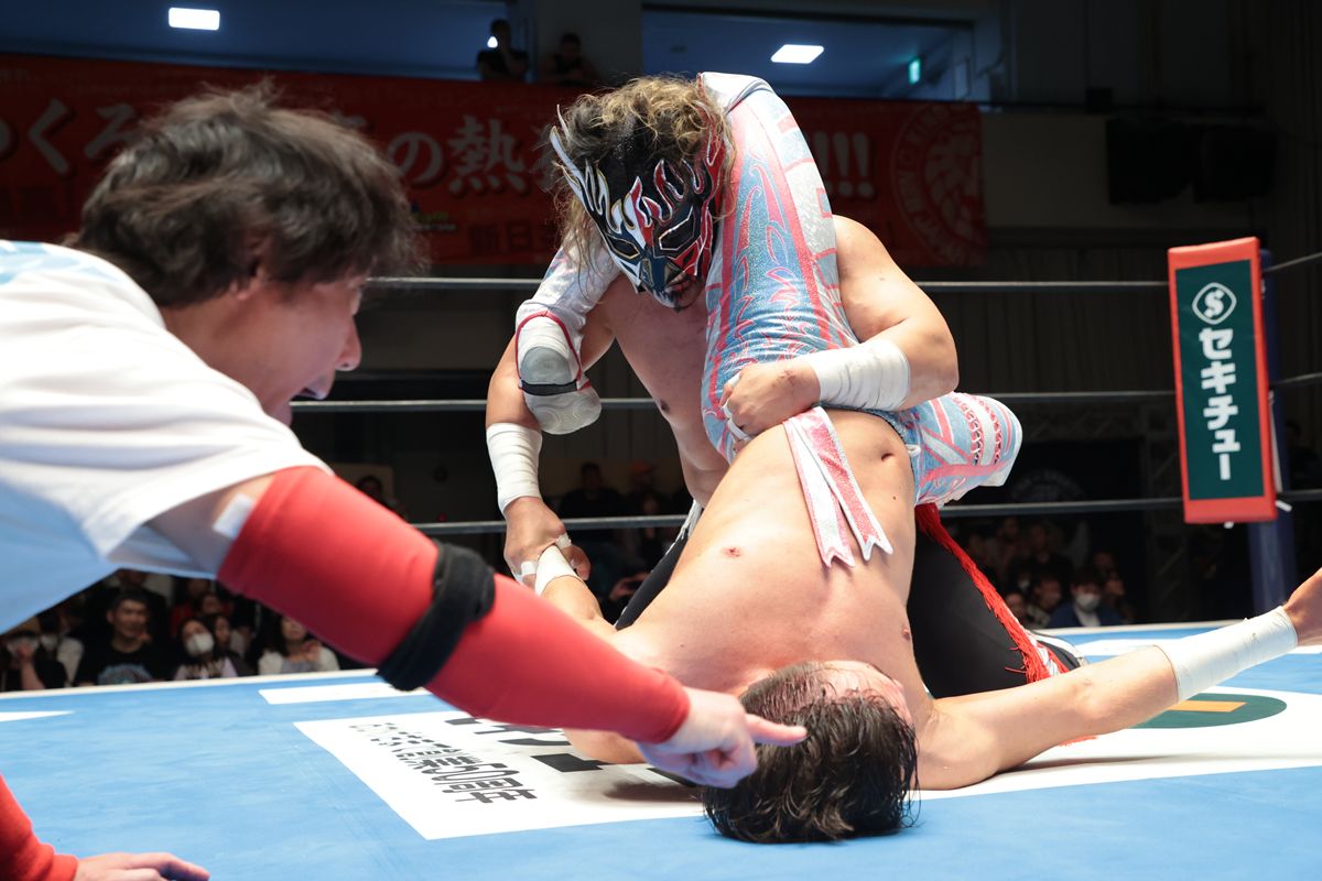 だが、この日ウェインの芯は折れなかった。何度も足を取られながらも冷静に対応し、場外へのムーンサルトアタック、そしてフロッグスプラッシュで反撃。さらに終盤にはプロディジープレックスを繰り出すも、王者はこれを返す粘りを見せた。