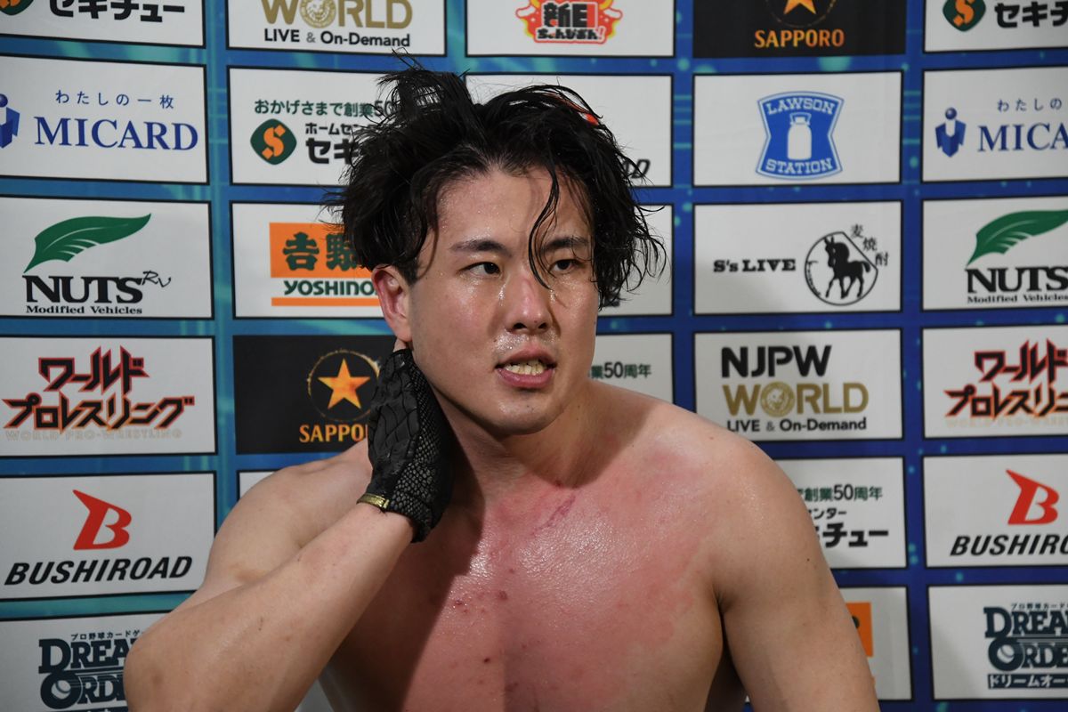 「まずは昨日の試合について改めて言ってやるよ。一番俺が納得してねえし、満足もしてねえんだ。結果を見たら勝ちだった。ただ、まあ見てたお客さんも、そう思う人もいたかも知れねえけど、高橋ヒロムが(試合を)決めようと思ったら決めれた。それは俺たちリングにいるヤツにしかわからないけど、そう見えてたんだったら……まあ勝ちは勝ちだけど、100パーセントの勝ちじゃないよな」