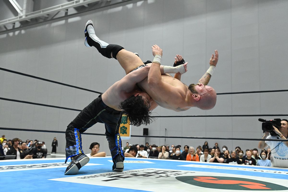 試合は序盤から静かに火花を散らす形で幕を開けた。互いの間合いを測るようなロックアップから始まり、徐々にペースを上げる展開へ。ワトが先手を取れば、エックスは鋭い反応で返す。両者の技量が噛み合う中、次第に攻防は激しさを増していった。