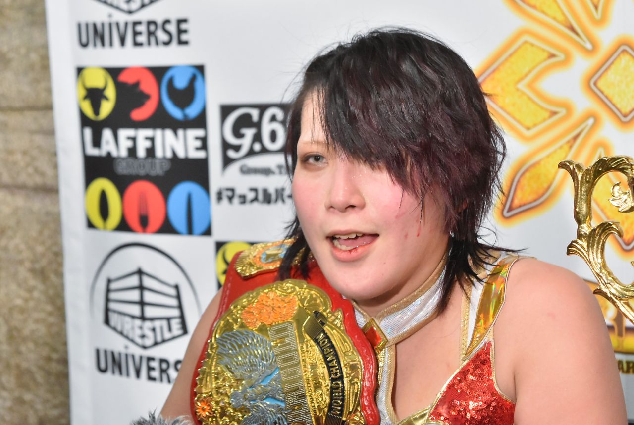 「無事にMIRAIからこのベルト守る事が出来ました。MIRAIには大事なとこでシングル負けた事もあった。色んな事を積み重なって絶対に負けたくない相手でした。今日私が勝ってこのベルト防衛出来ました。」