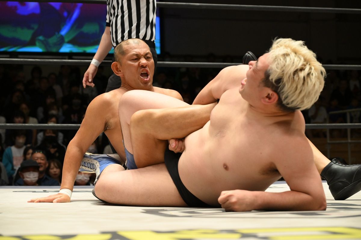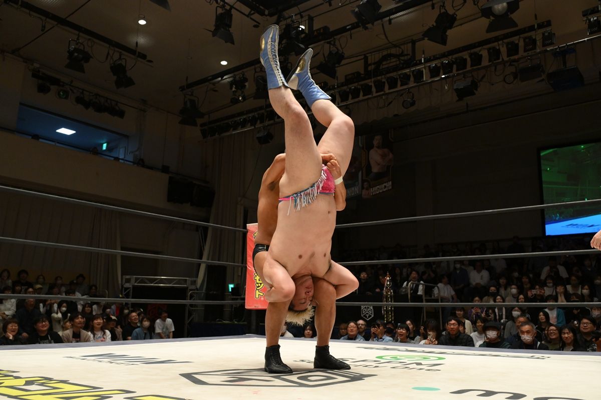 鈴木が張り手連発も、これまたリップロックで反撃。鈴木は顔面へのヘッドバットからスリーパーへ移行。ディーノは男色クローで脱出を試みるも、耐えた鈴木はゴッチ式パイルドライバーを決めて3カウントを奪取した。