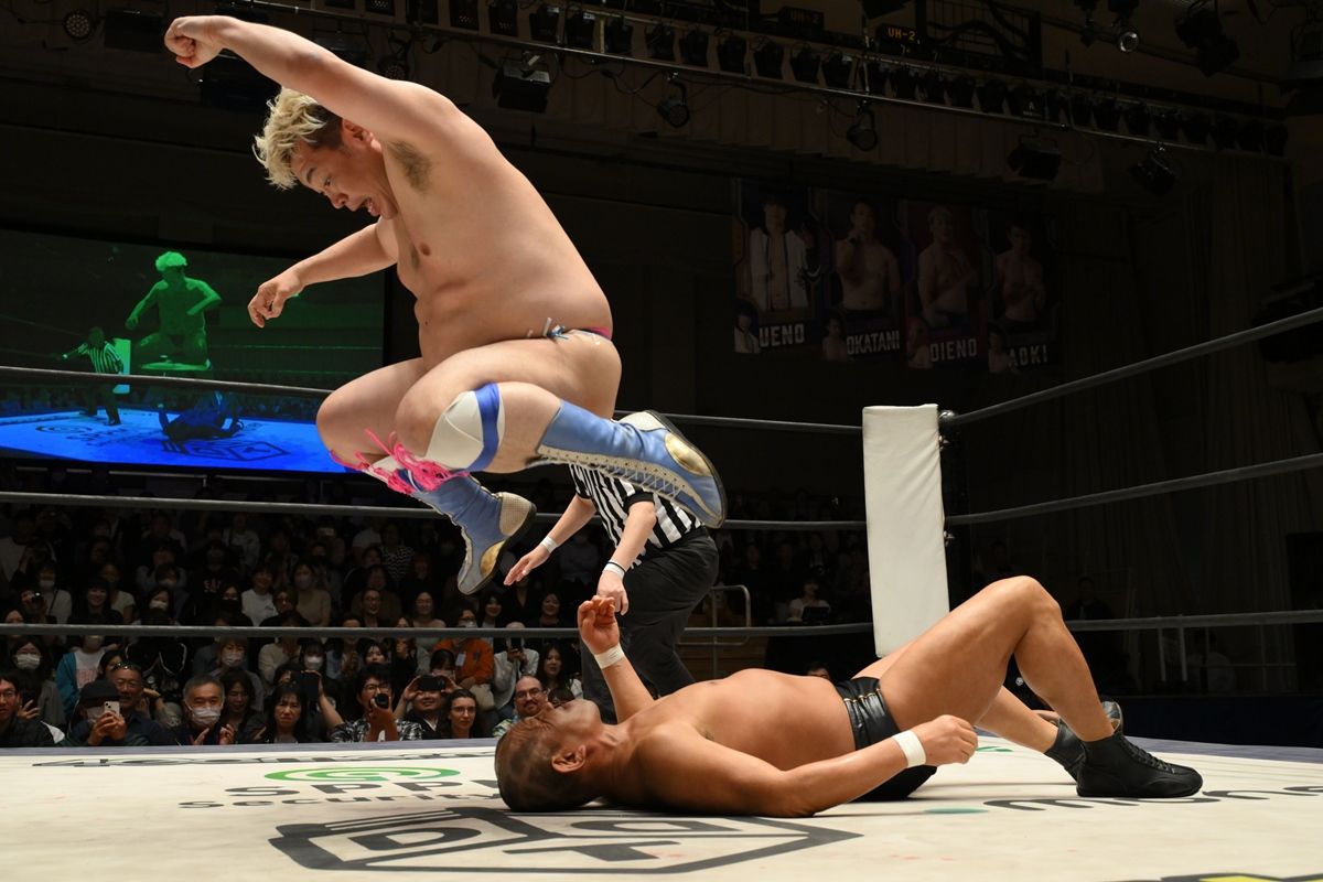 トップロープでの攻防で鈴木がスリーパーを仕掛けるも、ディーノはリップロックで阻止。さらに、ディーノはファイト一発から男色ドライバーを狙う。踏ん張った鈴木は我慢できず、ディーノのタイツに頭を突っ込むが、ゴッチ式男色ドライバーにはいけず。