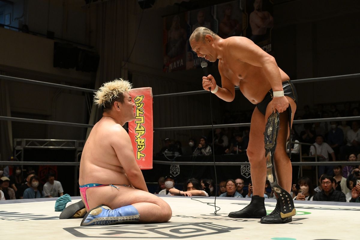王座奪取ならなかったディーノは「私の名前は男色ディーノ。それ以上、この試合で私に残っているものはない。DDTで22年、23年生きて来た怪奇派レスラー。私の名前は男色ディーノ、以上です」とコメント。