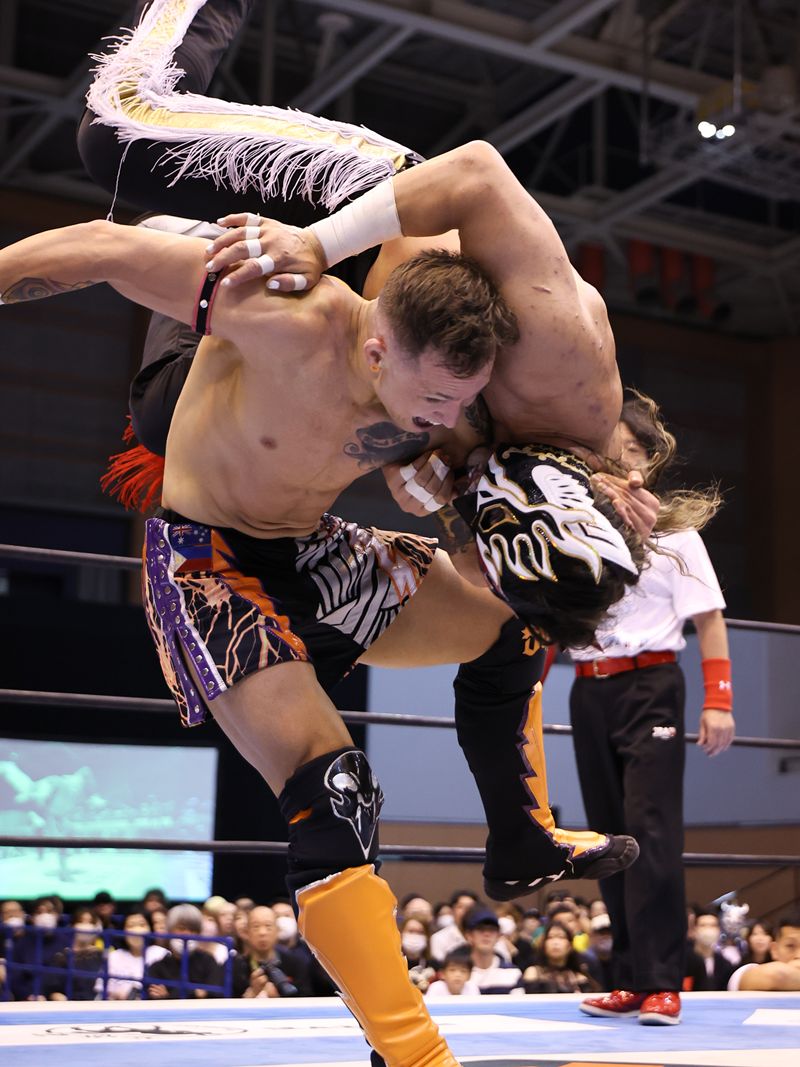 試合巧者らしく、反撃の糸口を掴むと巧みにイーグルスの足をとらえ、インディアン・デスロックやマフラーホールドなどで対抗。共に一歩も引かぬ攻防を繰り広げた。