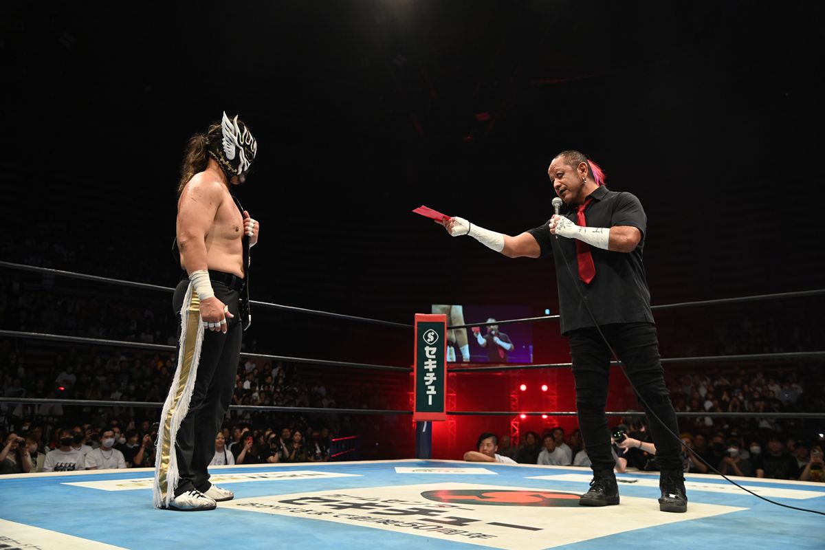棚橋組との6人タッグマッチを終えたエル・デスペラードがリング上で観客の歓声に応える中、葛西純が赤い封筒を手にリングへと歩み寄った。マイクを手にした葛西は、穏やかな語り口の中にも、確固たる覚悟をにじませて語り始める。
