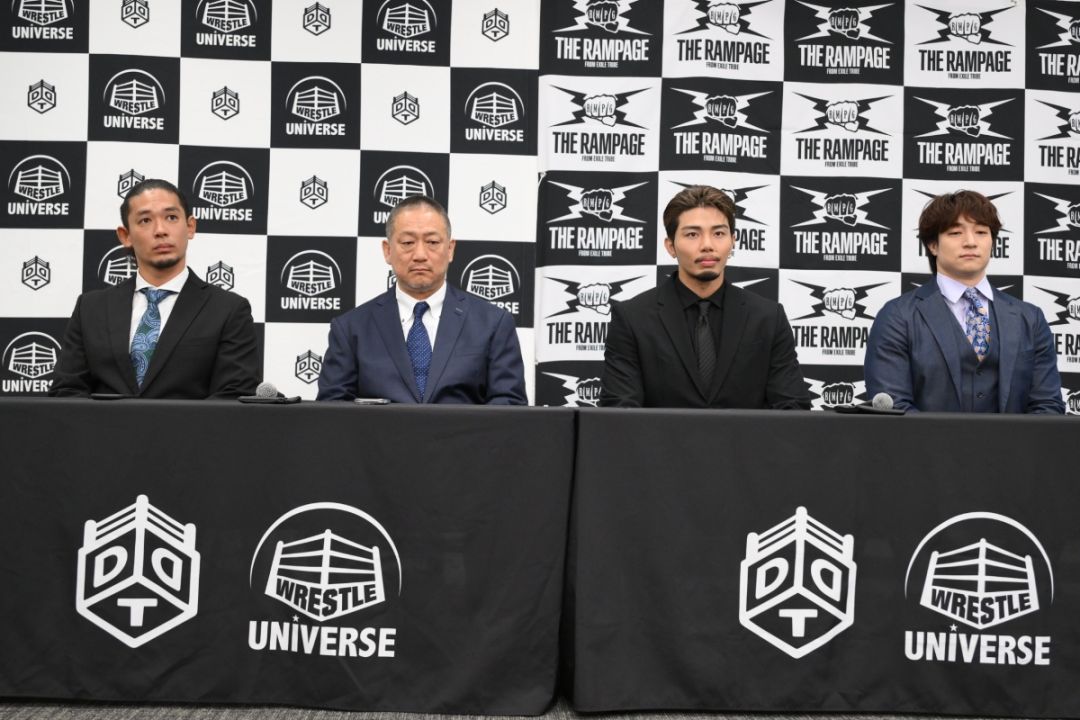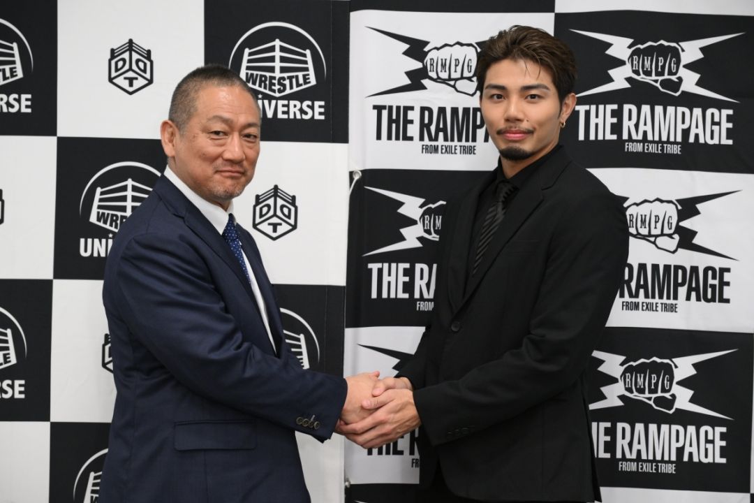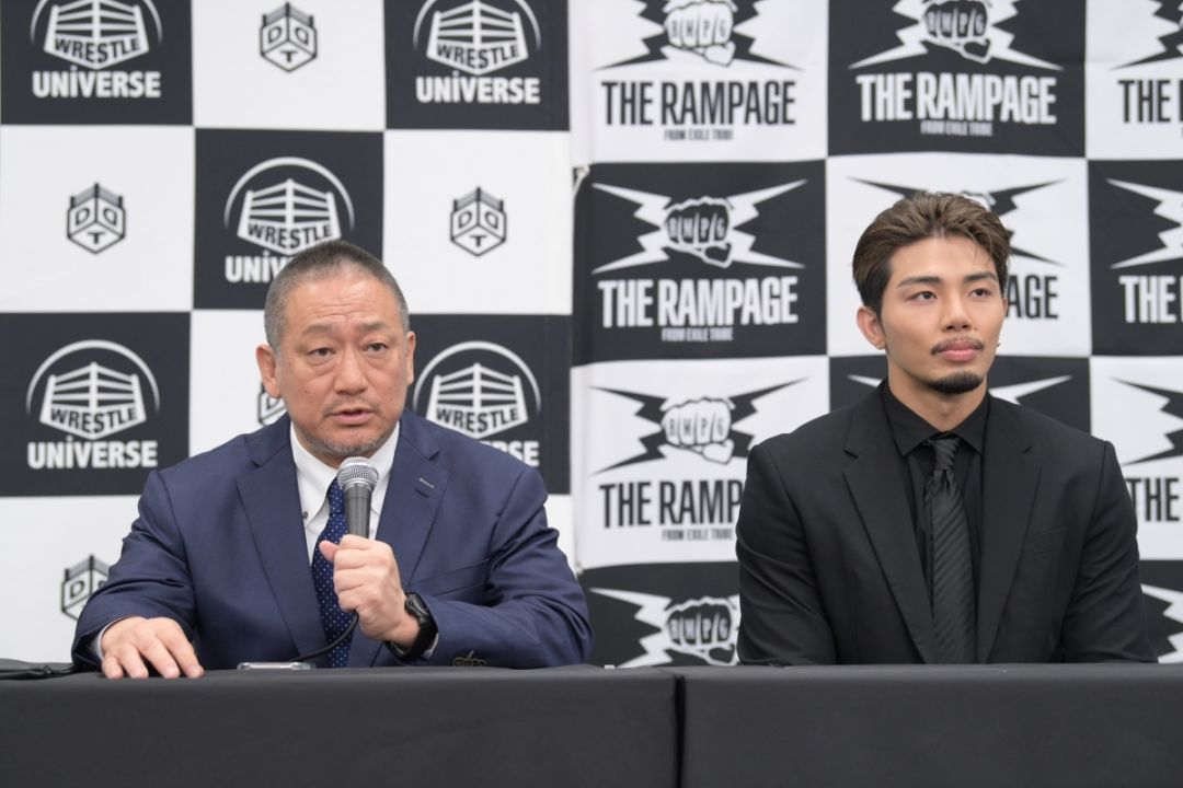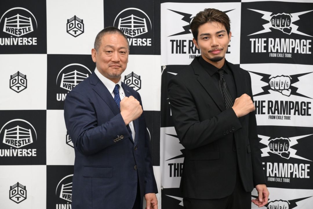 DDTプロレスが6月5日、都内で記者会見を開き、16人組ダンス&ボーカルグループTHE RAMPAGEの武知海青がパフォーマーとしてはLDH JAPAN所属のまま、プロレスラーとしてはDDTとエージェント契約を締結し、同団体に入団することを発表した。武知は7月13日の後楽園ホール大会でDDT戦士としての初戦を迎え、上野勇希、勝俣瞬馬とのトリオで、悪党軍団ダムネーションT.Aの佐々木大輔&岡谷英樹&MJポーと激突する。
